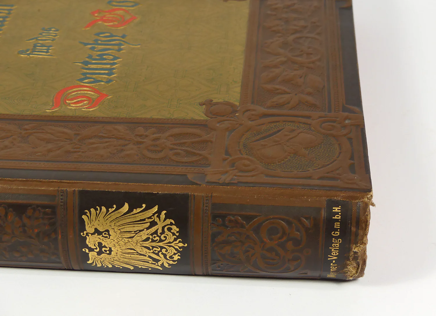 interesting cover design, embossed on front board and spine, with ivy decoration at outer border, crowns at each corner,