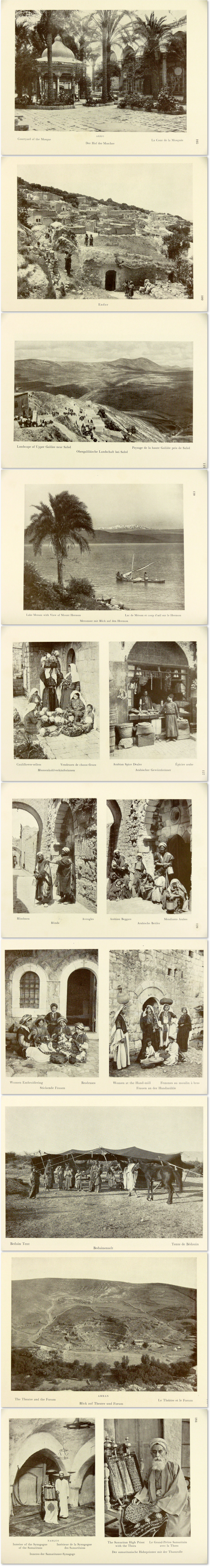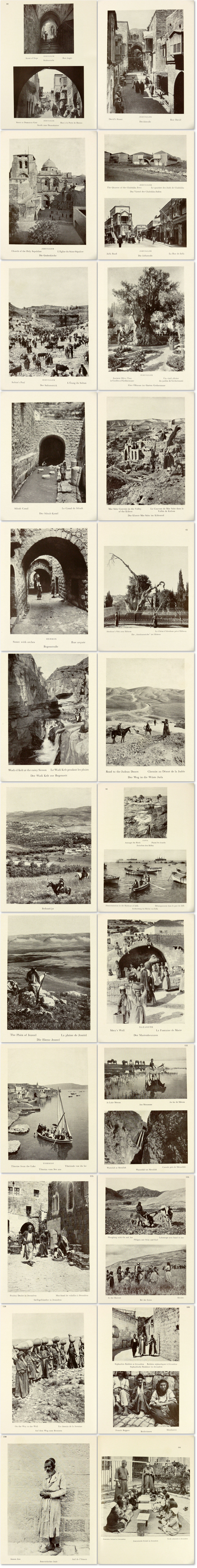 Remarkable photographic work of the 1920's on Palestine, the Holy Land, illustrated with 300 magnificent photographs depicting the places made immortal by those who are spoken of in the Bible, as well as all the landmarks which played a role in biblical countries since the days of Antiquity.