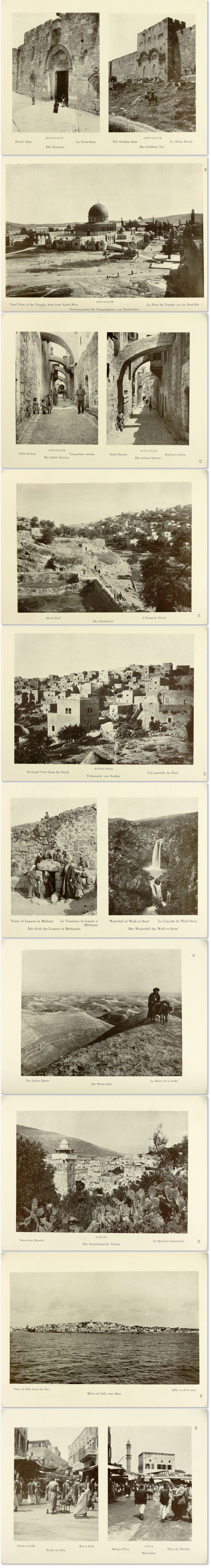 Jerusalem - Mount Zion - Valley of Hinnom - Valley of the Kidron - Mount of Offence - Village of Siloah - Siloah Canal - Mount of Evil Counsel - Bethlehem - Hebron - Gaza - Judean Mountains - Dead Sea - Bethany - Frank Mountain - Wadi es Sarar - Wadi Mukellik - Wadi el Kelt - Judean Desert - River Jordan - Plain of Jericho - Jericho - Mizpe - Ramallah - Samaria - Nablus - Mount Gerizim - Sebastije - Dschenin - Bittir - Adullam - Zarea - Ramleh - Ludd - Jaffa - Plain of Saron - Audjah - Audjah River - Mount Carmel - Haifa - Akko - Plain of Jesreel - Mount Tabor - The Brook Kishon - Village Jezreel - Endor - Nazareth - Jarmuk Cataracts - Daganiah - Tiberias - Lake of Tiberia - Bethsaida - Safed - Lake Merom - Mount Hermon - The Plain of the Jjon - Village Ebl - Source of Jordan - The Ruins of Jericho - Kisarije - Amman - Besan - Es-Sanamen - Kades - Thaanek - Baalbek - Ed-Dikke - Tel Hum - Umm el Amid - Kefr Birim - Meron - Ramleh - Atlith - Galilee - Talpioth - Beth Hakerem - Tel Aviv - Kirjath Anavim - Ness Zionah - Rechowoth - Mikweh Jisrael - Rischon le Zion - Petach Tikwah - Sichron Jaakow - Schfejah - Nahalal - Ejn Charod - Kfar Jacheskel - Tel Joseph - Beth Alpha - Daganiah - Kinereth - Migdal - Rosch Pinah - Kfar Gileadi - Chamarah .... and many others